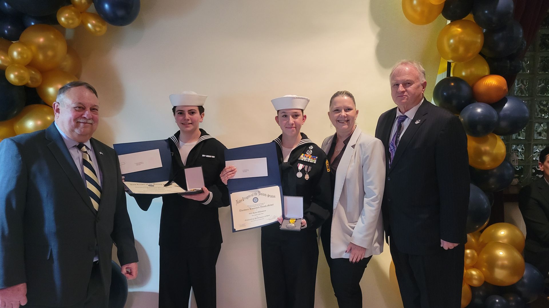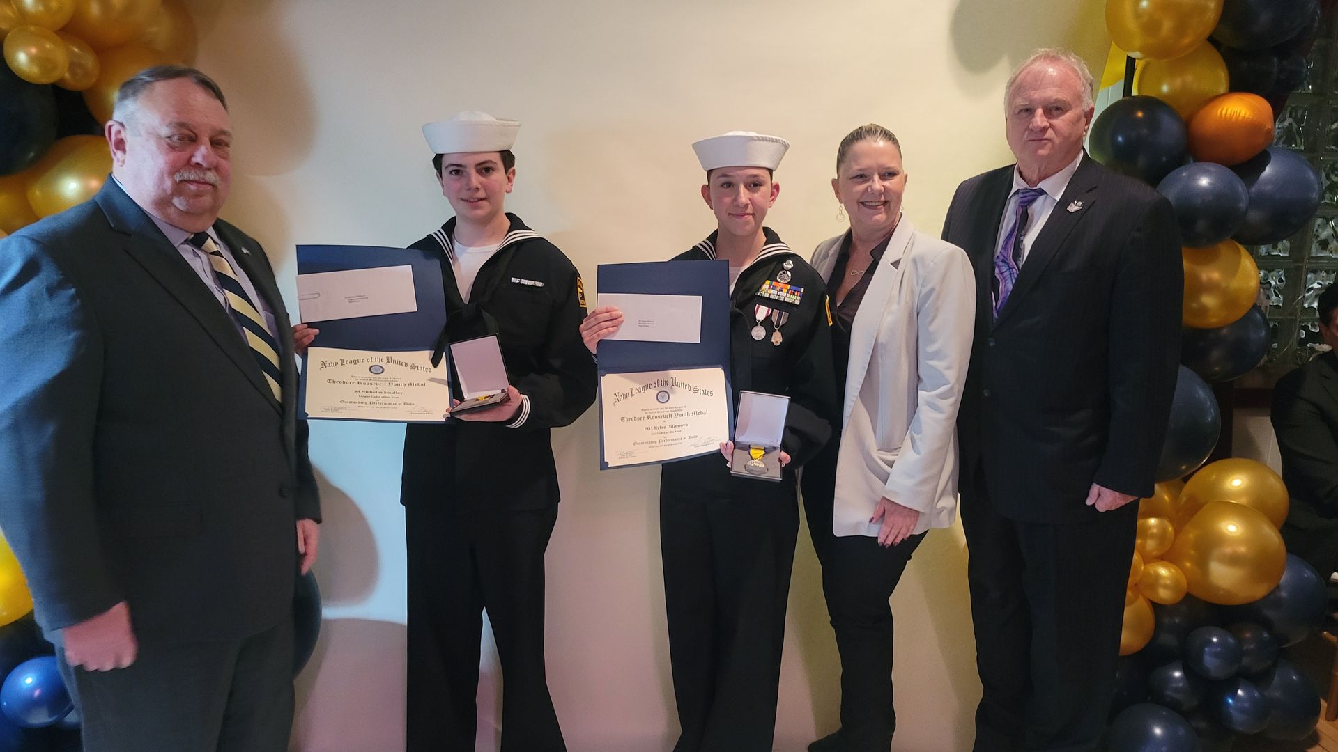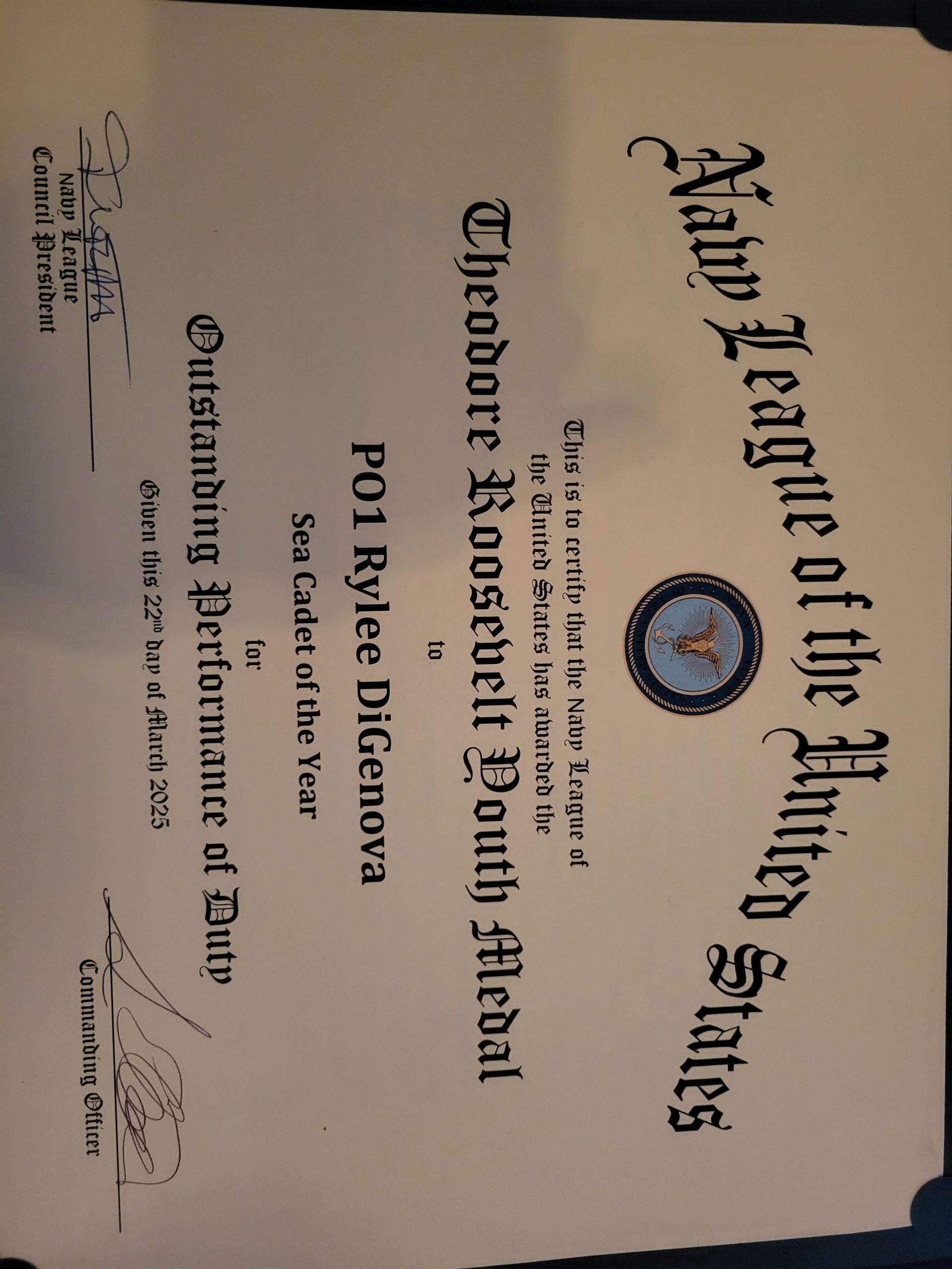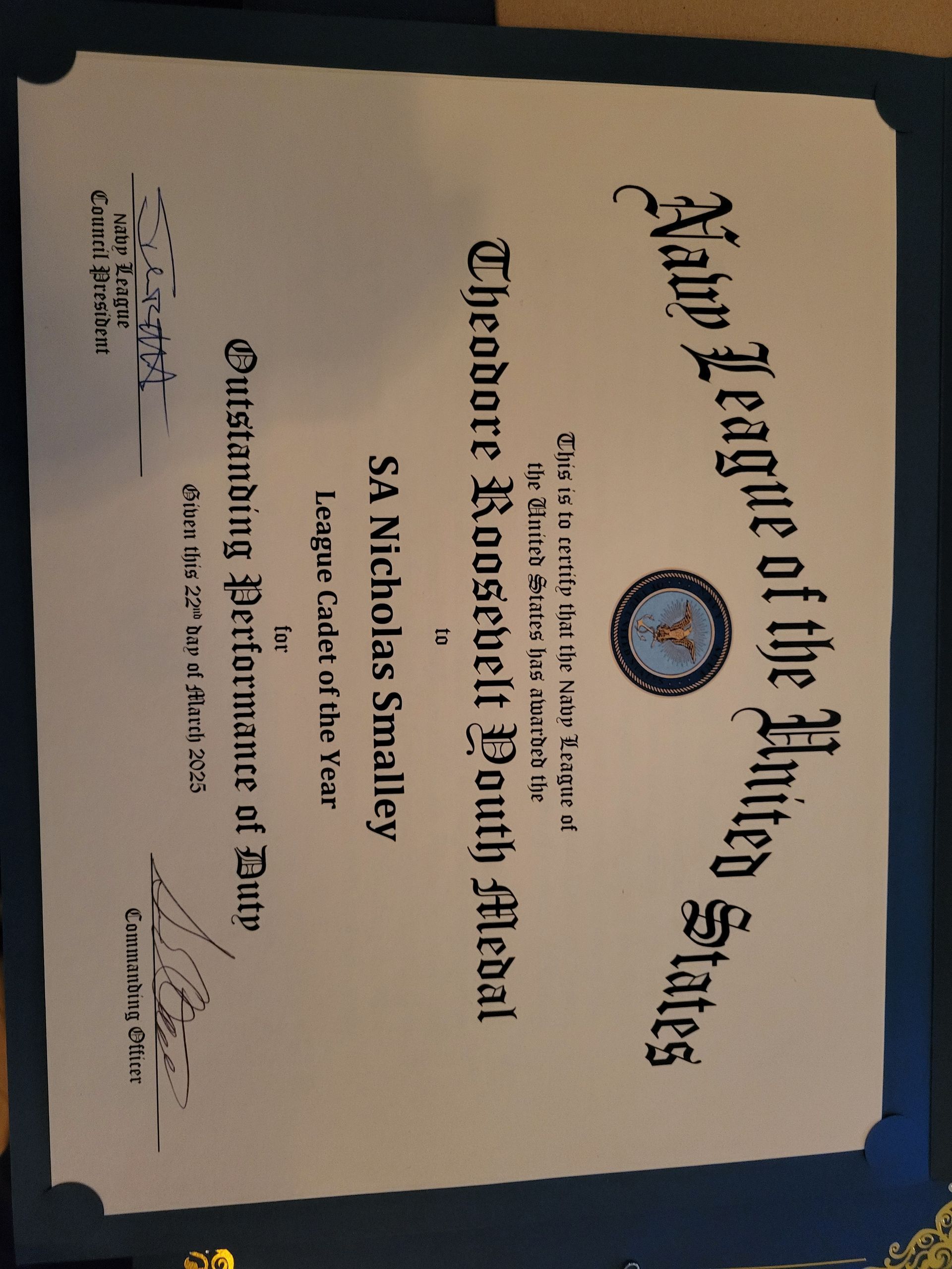 The Navy League of the United States, Philadelphia Council, President William Youngblood presented the Outstanding Cadet medal to