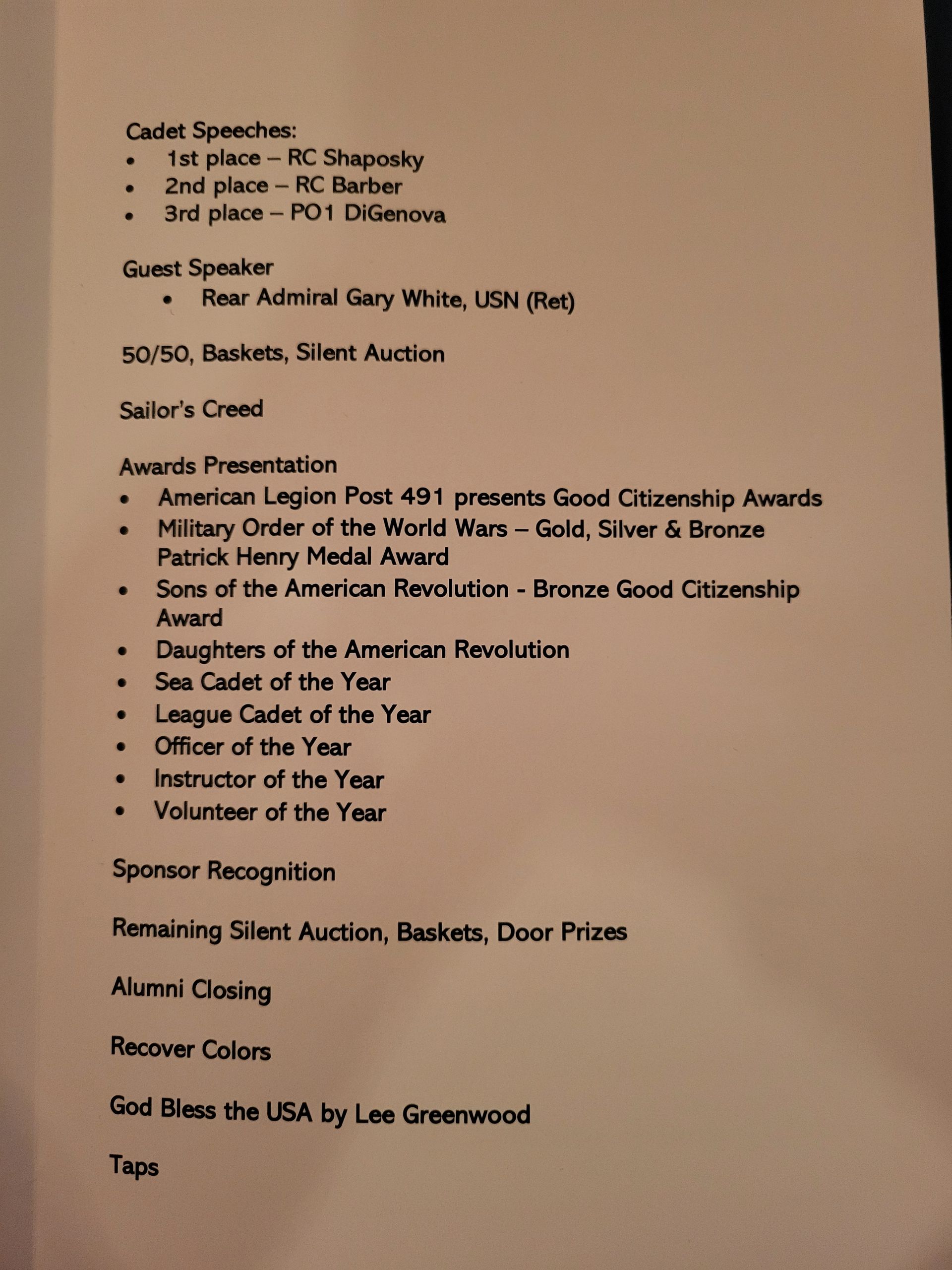 22: Attended Women’s Business Conference with Rear Admiral Patricia Wolfe (Ret.) including coordination with local U.S. Naval Sea Cadet Mason Division Color Guard to present Colors (Jeff Shannon and Bill Youngblood); and